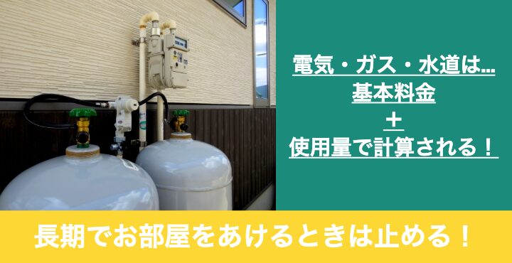 長期間お部屋を空ける場合は、電気・ガス・水道の供給の停止をしましょう。