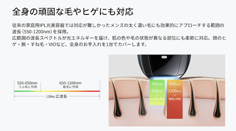 『Ulike X』は、光脱毛器になりますので、毛が剛毛になって生えてきた!?という心配は少ないです。